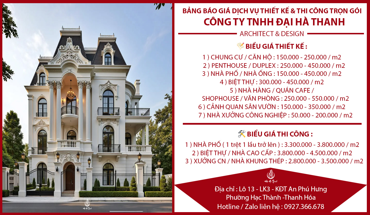 Công ty TNHH Đại Hà Thanh tự hào là đơn vị hàng đầu tại Thanh Hóa mang đến dịch vụ thiết kế và thi công trọn gói với chất lượng vượt trội và chi phí tối ưu . Dưới đây là bảng giá tham khảo chi tiết các hạng mục dịch vụ của chúng tôi !