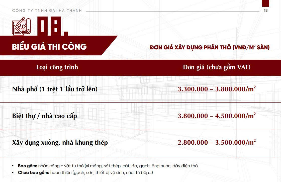 Đại Hà Thanh kính gửi đến quý vị bảng báo giá xây nhà phần thô. Quý vị cũng có thể đề suất vật tư và chủng loại theo ý mình, song song với việc tư vấn của chúng tôi với quý vị về vật tư cũng như chủng loại, sao cho mục đích sử dụng hiệu quả, bền vững và tính thẩm mỹ cũng đạt yêu cầu. Tất cả sẽ cấu thành một căn nhà đẹp như mong muốn của quý vị.