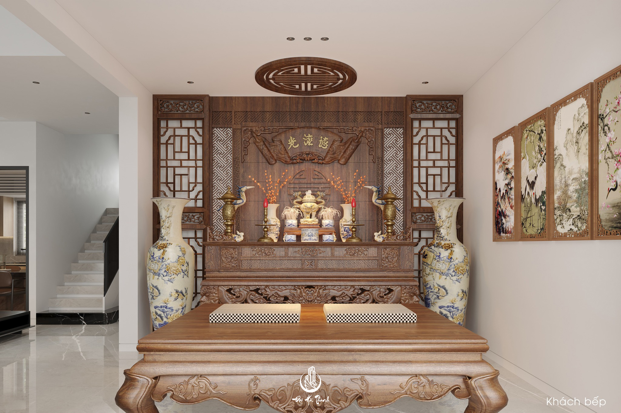 Khi thiết kế nội thất nhà , tổng thể kiến trúc nhà thường ít thay đổi . Đặc biệt là các khu vực chức năng chính. Nếu là những ngồi nhà truyền thống ở làng quê Việt Nam e, bàn thờ được xếp lại khu vực trung tâm căn nhà . Phòng khách thường là nơi họ sử dụng đặt bàn thờ .