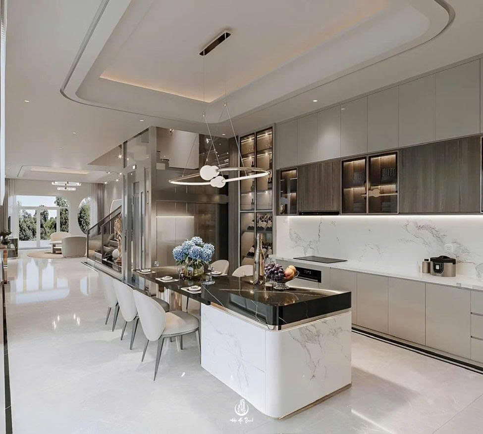• Kiến trúc thanh lịch: Ngôi nhà nổi bật với những đường nét kiến trúc tinh tế, hiện đại, tối giản nhưng không hề đơn điệu. Gam màu trung tính kết hợp cùng các vật liệu cao cấp tạo nên vẻ ngoài sang trọng, bền vững.