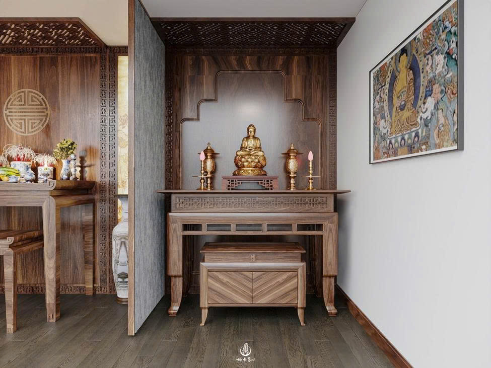 • Không gian tâm linh: Phòng thờ được bố trí riêng, tạo không gian trang nghiêm và ấm cúng, thể hiện sự tôn kính và gìn giữ nét đẹp văn hóa truyền thống.